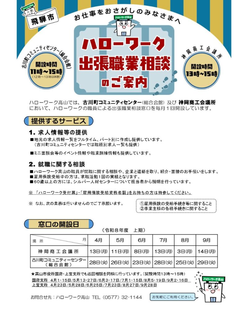 神岡商工会議所では、ハローワーク高山の職員による出張職業相談の窓口を月1回 13時~15時に開設しています。高山へ行かなくても、前日までの最新の求人情報をチェックできます。