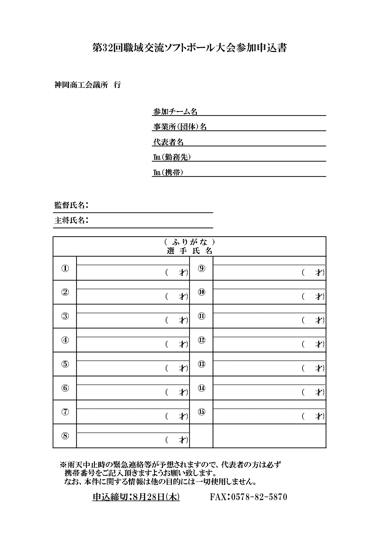 ◆申込方法:会社にちなんだチーム名をつけていただき、下記の申込書に必要事項をご記入の上、神岡商工会議所まで、FAXまたはご持参にてお申し込みください。